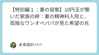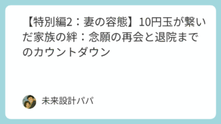 子育て 【特別編2:妻の容態】10円玉が繋いだ家族の絆:念願の再会と退院までのカウントダウン 未来設計パパです。前回、妻の精神科入院という絶望的な状況の中、10円玉で繋いだ電話の軌跡、そして看護師さんの粋な計らいにより、私は妻と10分間の面会を果たしました。この再会で「家族の絆」が折れていないことを確認し、「安心への執着」を固くした... 2025.10.08 子育て税金・資産形成節約・お金の実録
