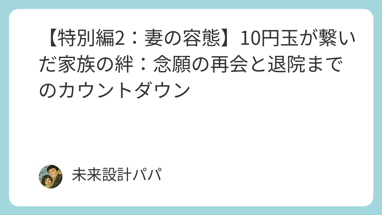 この提案は、妻の実家も快く受け入れてくださり、入院6週目での退院日程が決まりました。妻の回復を最優先し、親の精神的な負担を最小限に抑えるこの決断こそが、まさに私たちが目指す**「家族防衛戦略」**でした。