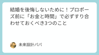 節約・お金の実録 結婚を後悔しないために!プロポーズ前に「お金と時間」で必ずすり合わせておくべき3つのこと 離婚原因上位の「お金のストレス」を防ぐ!未来設計パパが伝授する、結婚前に確認すべき「お金・時間・家族」の3大テーマ。FIRE達成に向けた家計管理、住宅の価値観、自己投資の時間配分まで徹底解説。 2025.11.01 節約・お金の実録