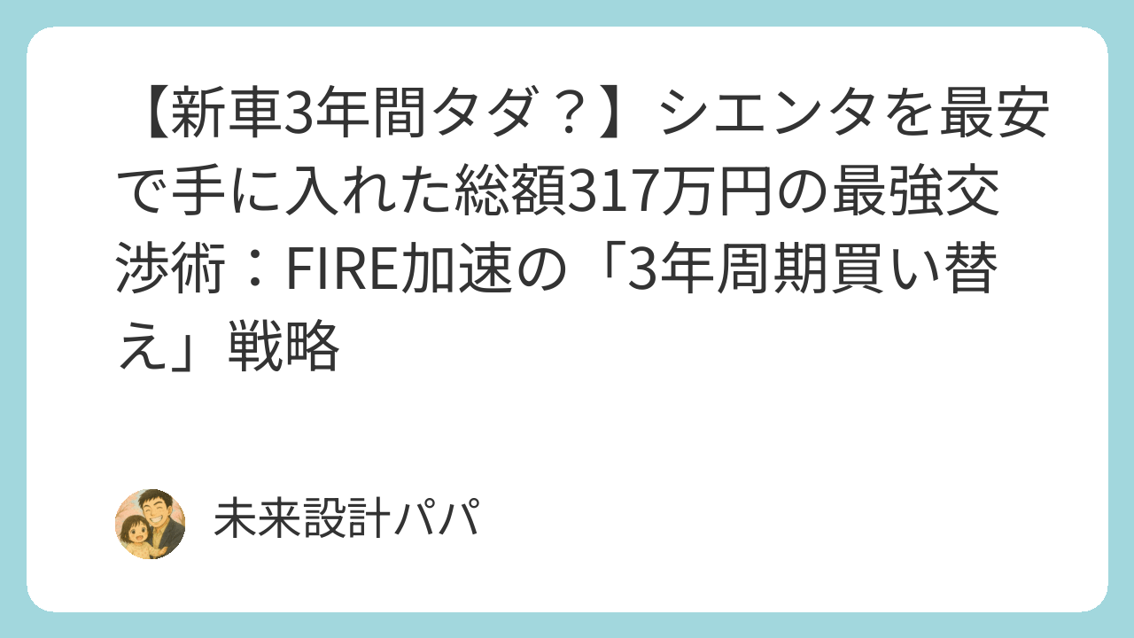 「切実な体験」をバネに、「論理的な戦略」を構築すれば、家計の防衛と目標達成は両立できます。ぜひ、あなたの愛車購入計画にも、この「未来設計パパ流・最強交渉術」を取り入れ、固定費削減と資産形成を加速させてください。
