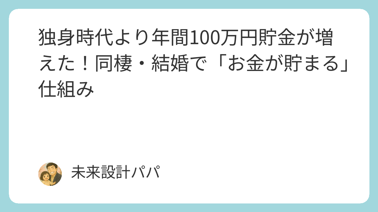 独身時代は年間平均で20万円ほどの貯金ペースでしたが、同棲・結婚後はなんと年間100万円以上も貯金が増える仕組みを構築できたのです。