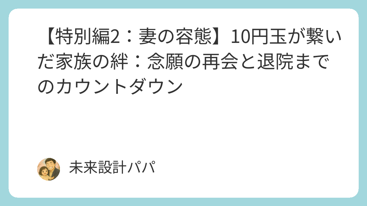 未来設計パパです。前回、妻の精神科入院という絶望的な状況の中、10円玉で繋いだ電話の軌跡、そして看護師さんの粋な計らいにより、私は妻と10分間の面会を果たしました。この再会で「家族の絆」が折れていないことを確認し、「安心への執着」を固くした私。今回は、妻が入院に至った最悪の初診察、そして驚異的なスピードで「外出・外泊」へと進んだ回復の道のりと、その裏で私が下した現実的な「家族防衛」の決断について詳細に記録します。